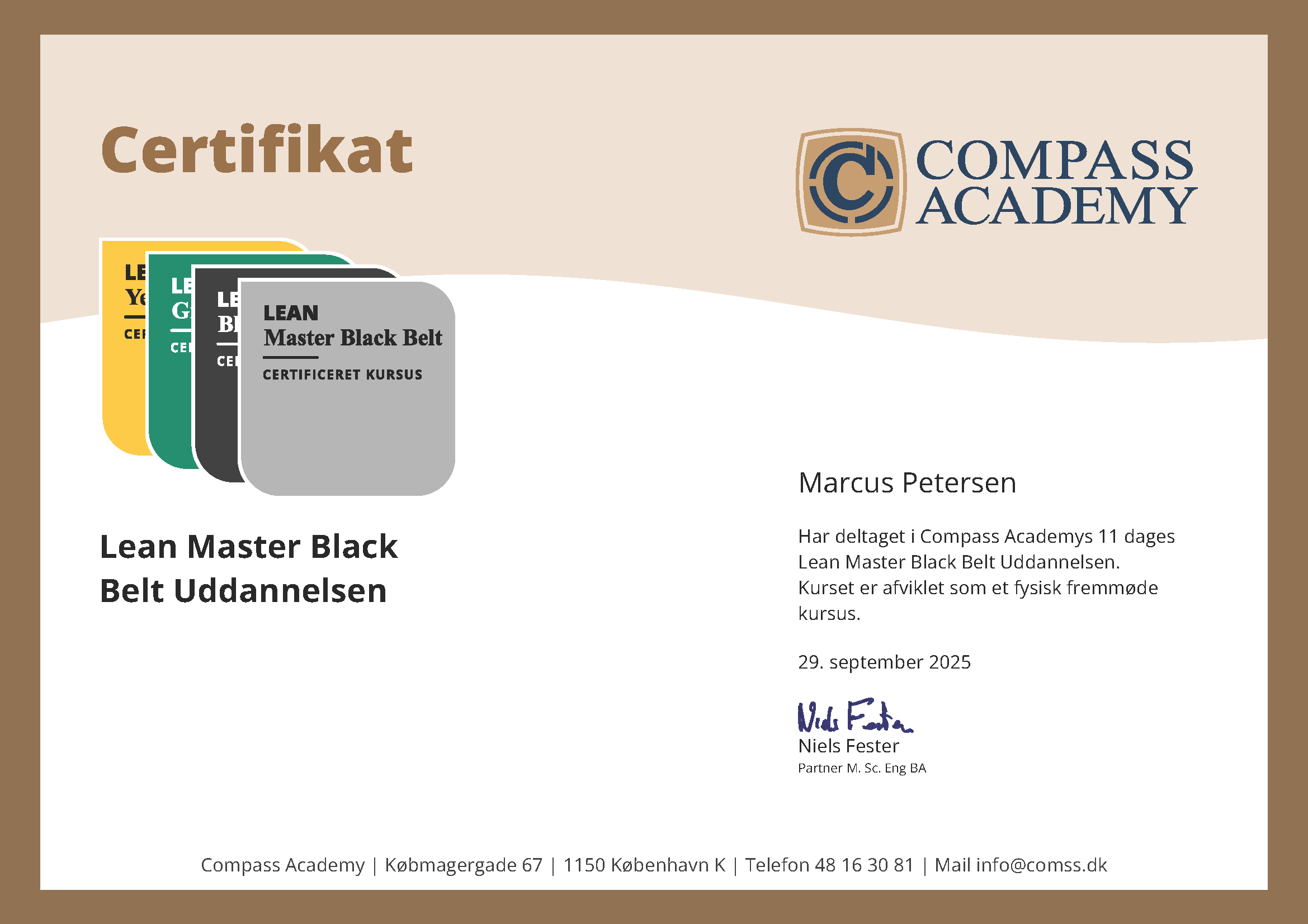 Certificering er indeholdt i dit kursus honorar. Certificering har til formål at forankre og kvalitetssikre den viden du har tillært på uddannelsen og akademiet anbefaler at du lader dig certificere. Lean Master Black Belt certificering udgøres af multiple choice test's samt små projektopgaver du afleverer under vejs i dit kursusforløb.